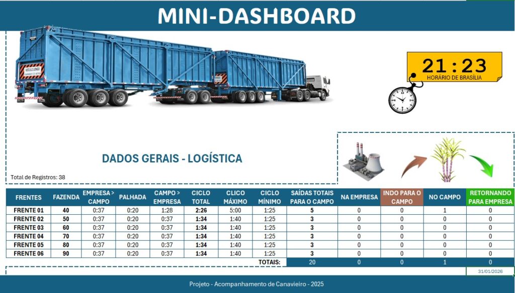 Com esses dados, a planilha calcula automaticamente as médias de translado, o tempo médio de ciclo total e a quantidade de viagens. Você terá em mãos a Hora Estimada de Chegada (ETA), permitindo uma programação muito mais assertiva da recepção na usina.